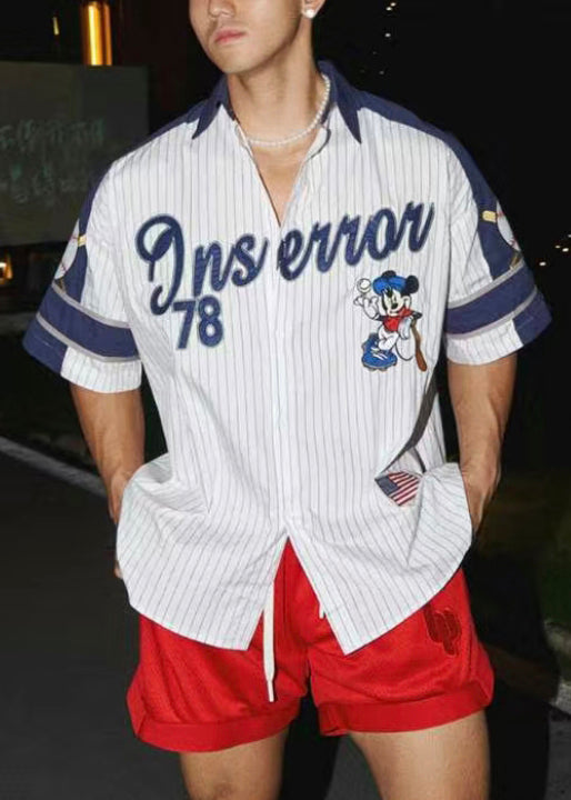 French White Striped Letter Patchwork Cotton Men Shirts Summer